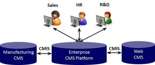 The premise is that content from every system is stored in the Enterprise CMS Platform. Customer deliverables, invoices, performance reviews, budgets, design specs, correspondence, and any other piece of content that your organization creates or captures. The advantages are obvious:
