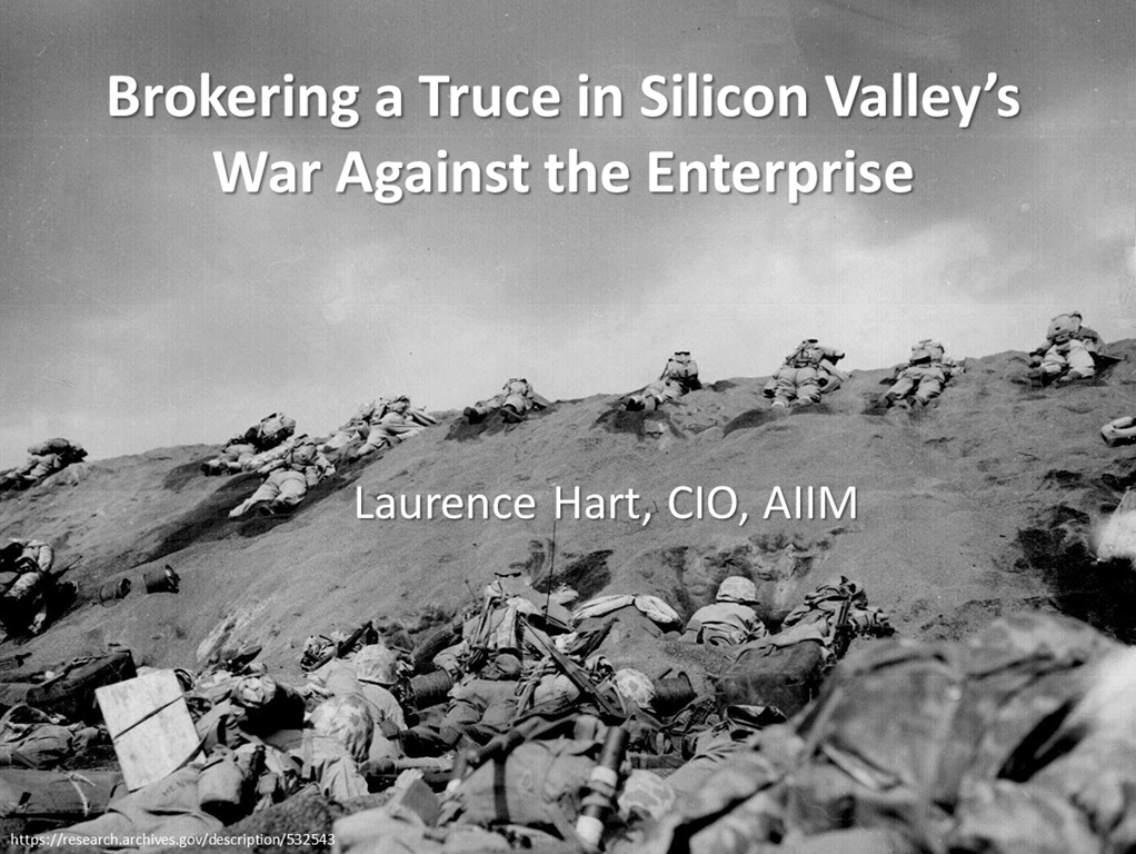 In March, I gave a keynote at the annual AIIM Conference. It was based upon my post, Silicon Valley’s War on the Enterprise. I’ve been hoping to share the video with everyone, but that doesn’t seem probable due to some bad luck.