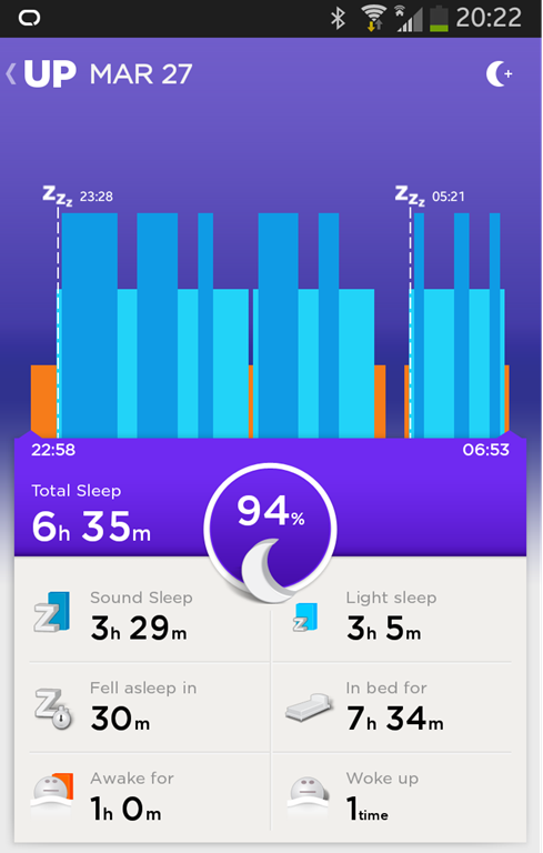 The other thing the UP24 measure is sleep. It has a sleep mode but you can use the app to add sleep periods when you forgot to switch it over. This is very interesting as it tracks when you are awake, lightly asleep, or in a deep sleep.